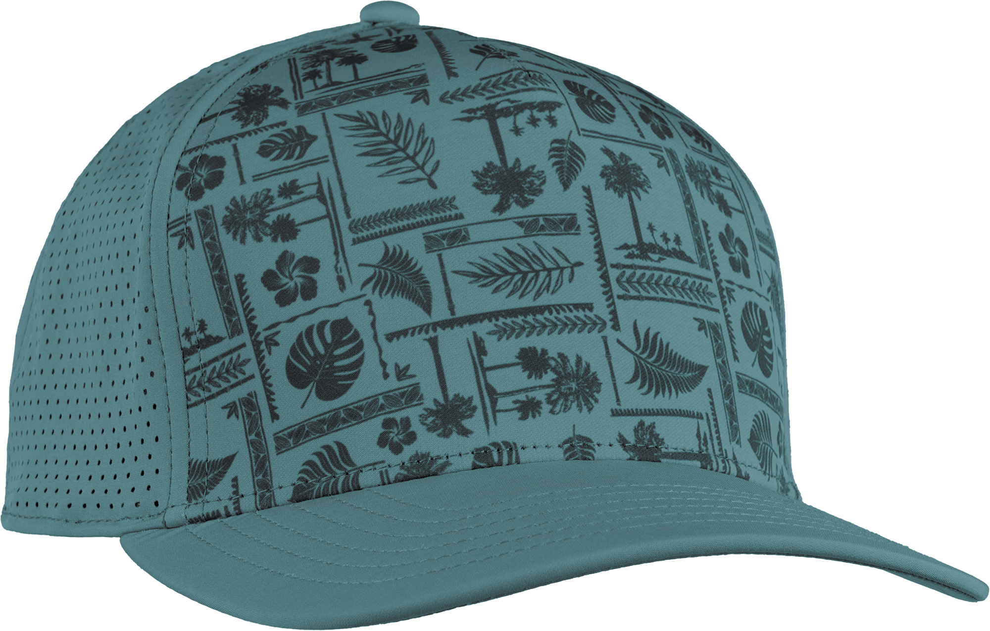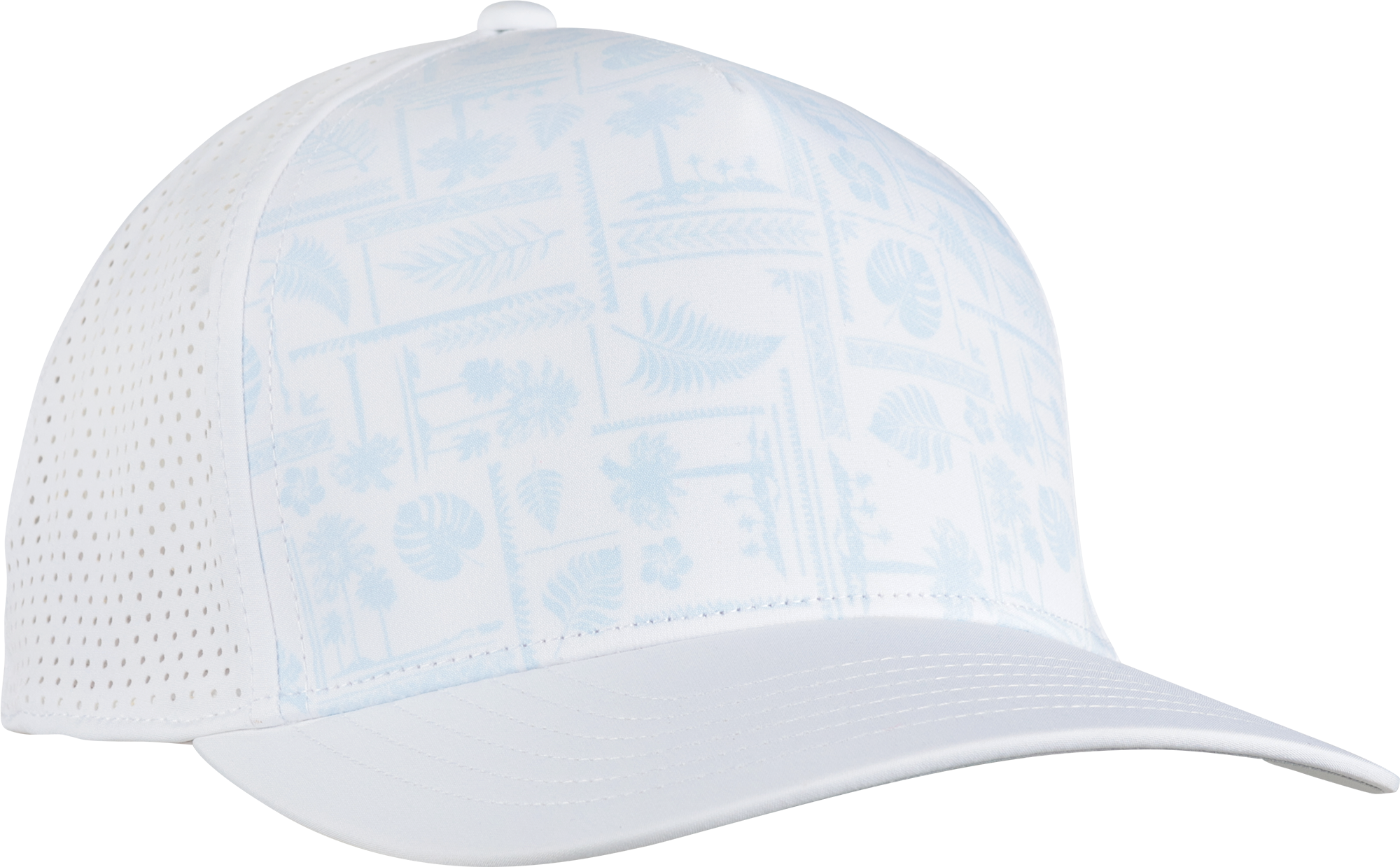 Classic Fit. Structured. 5-Panel. Performance Poly w/ Printed Design Front. Laser Perforated Back Panels. Velcro Closure.SPF 50+