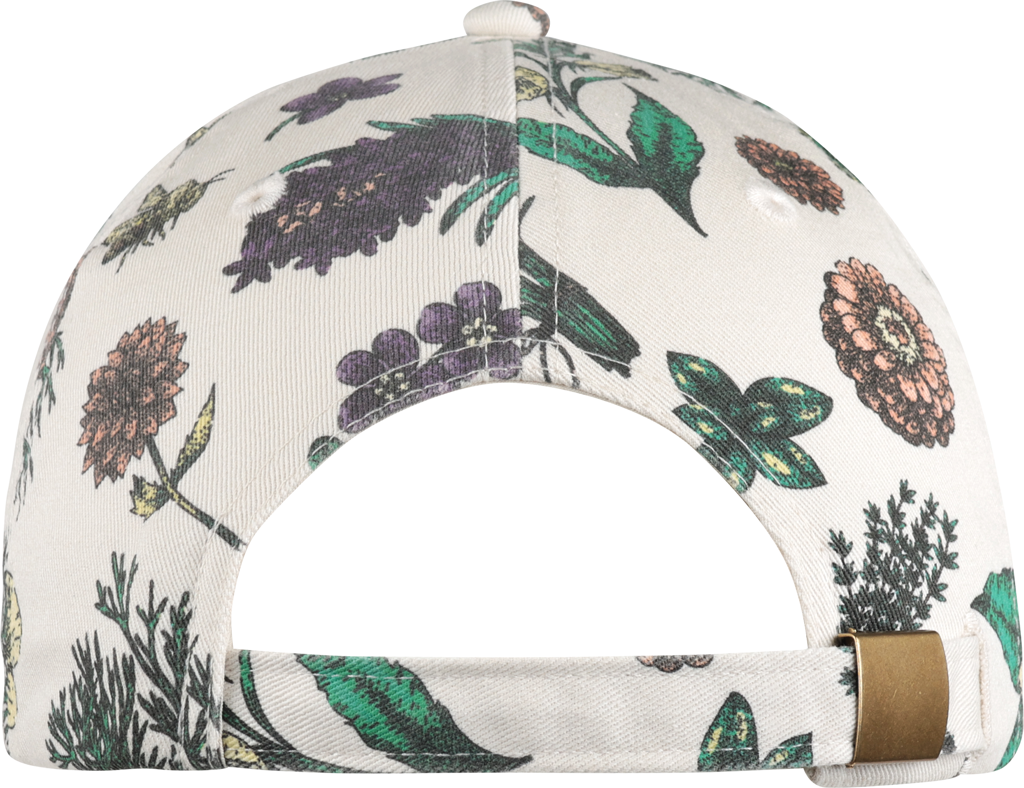 Unstructured. Washed Cotton Twill w/ All-Over Garden Print. Adjustable Slider Closure w/ Buckle. Pattern elements vary per piece.