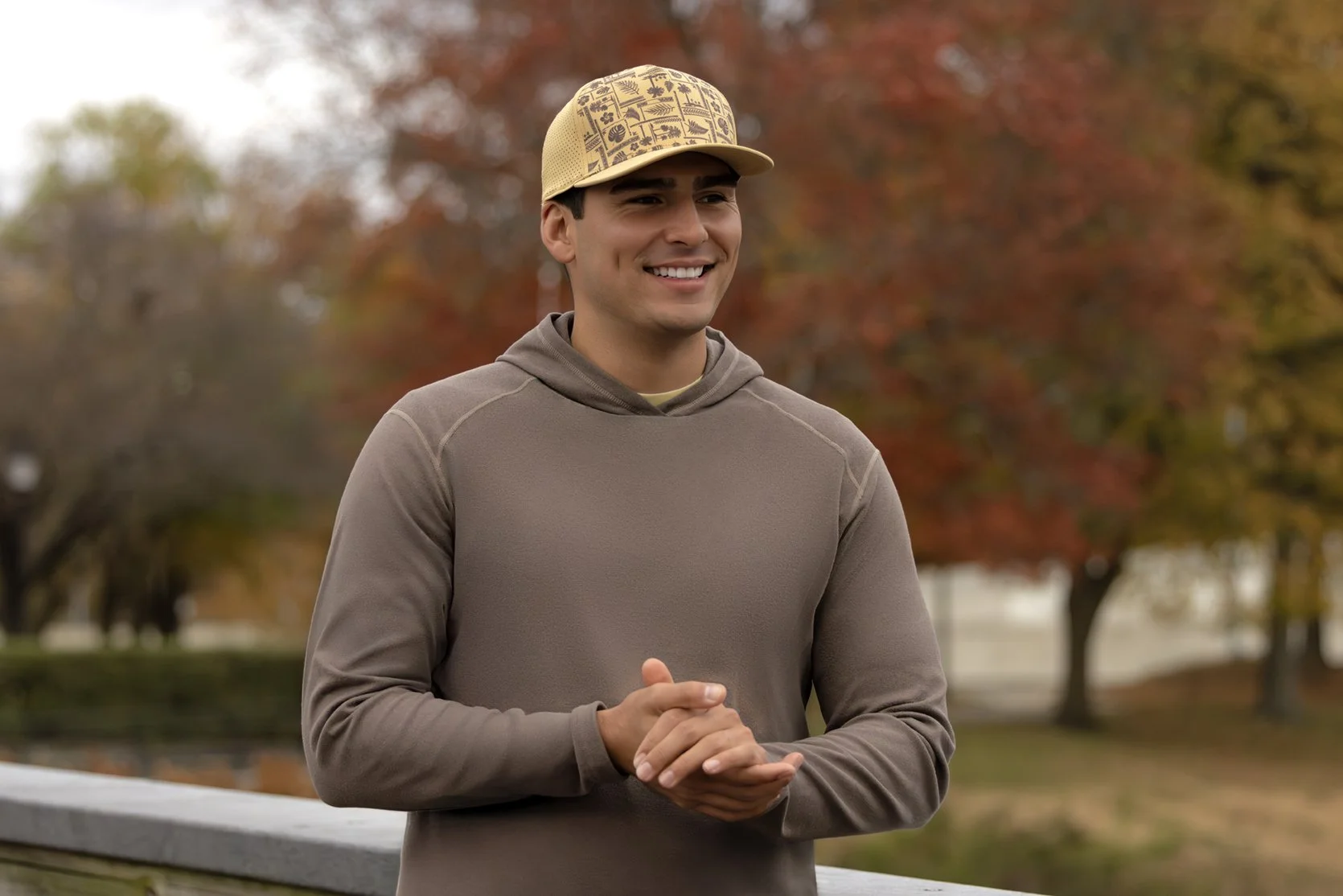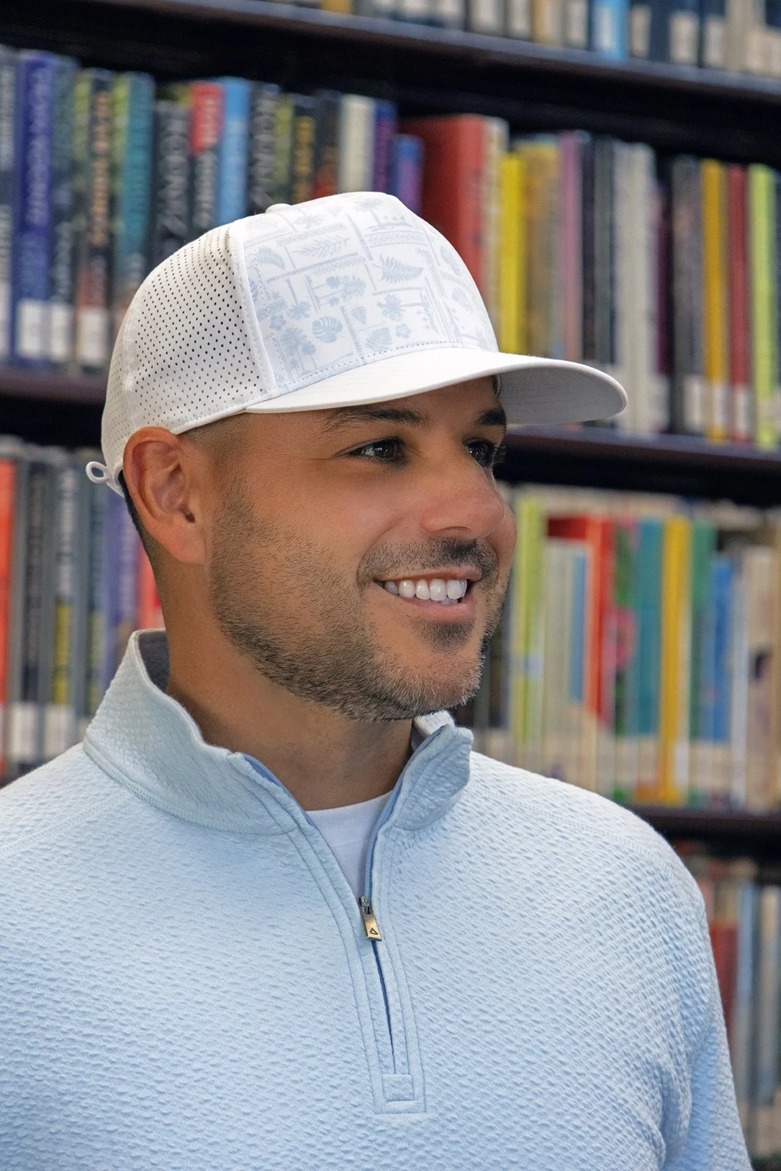 Classic Fit. Structured. 5-Panel. Performance Poly w/ Printed Design Front. Laser Perforated Back Panels. Velcro Closure.SPF 50+